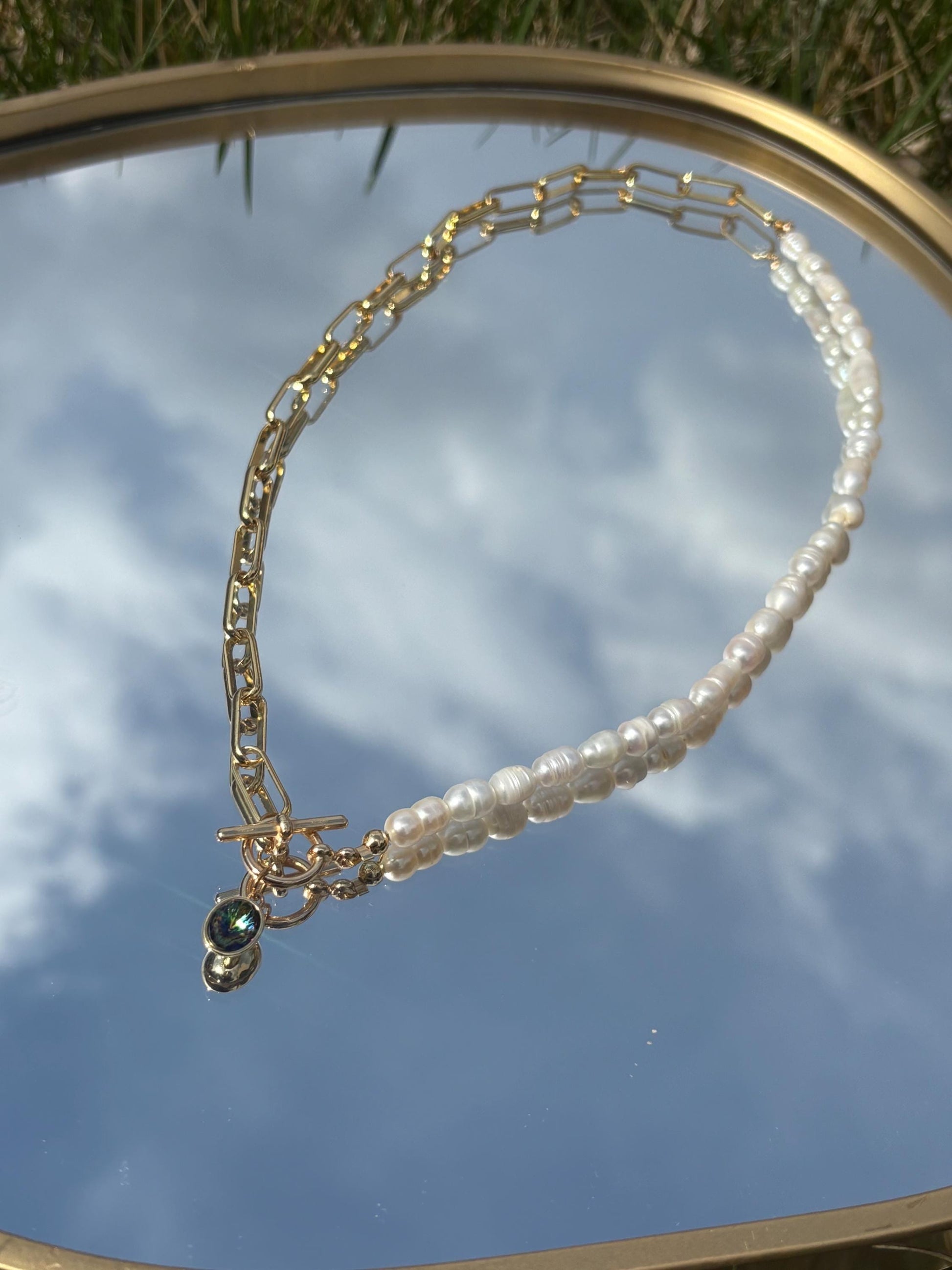 14K Gold Plated Paperclip & Freshwater Pearl Necklace with Green Austrian Crystal – 19.5” Toggle Clasp