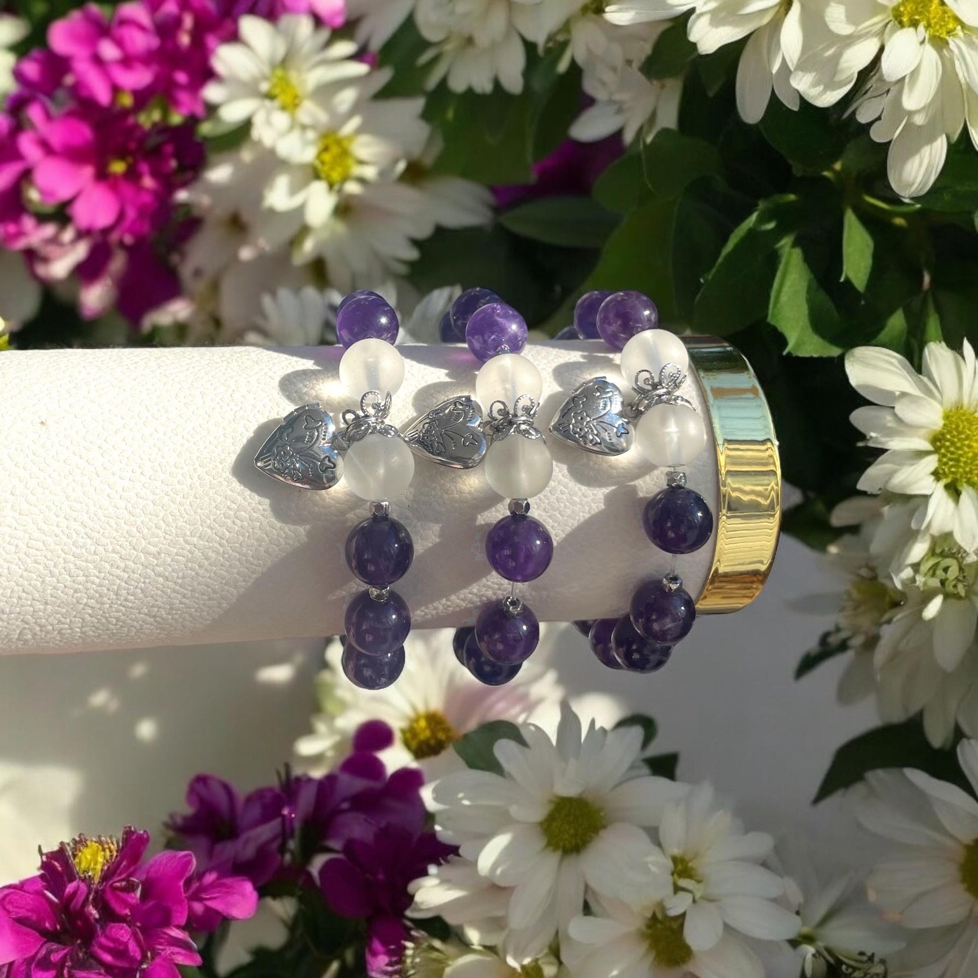 Elevate your style and embrace tranquility with this stunning Amethyst Bracelet featuring a delicate heart locket. Made with natural amethyst beads, renowned for their calming and protective properties, this bracelet not only adds a touch of elegance to any outfit but also promotes emotional balance and spiritual growth. The soothing purple hues of the beads are beautifully complemented by the silver-tone heart locket, which opens to hold a small, cherished picture. Perfect for daily wear or special occasions, this amethyst bracelet with a heart locket serves as a meaningful accessory that combines beauty, healing energy, and sentimental value. Carry a piece of serenity and a loved one close to your heart wherever you go. Each bracelet is made to order.