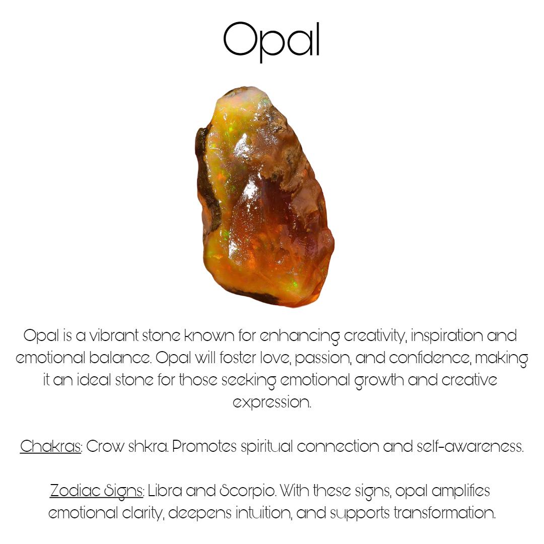Healing Benefits: **Citrine** is known for promoting positivity, boosting self-confidence, and aiding in manifestation, while **Opal** is believed to enhance emotional healing, creativity, and spiritual balance.