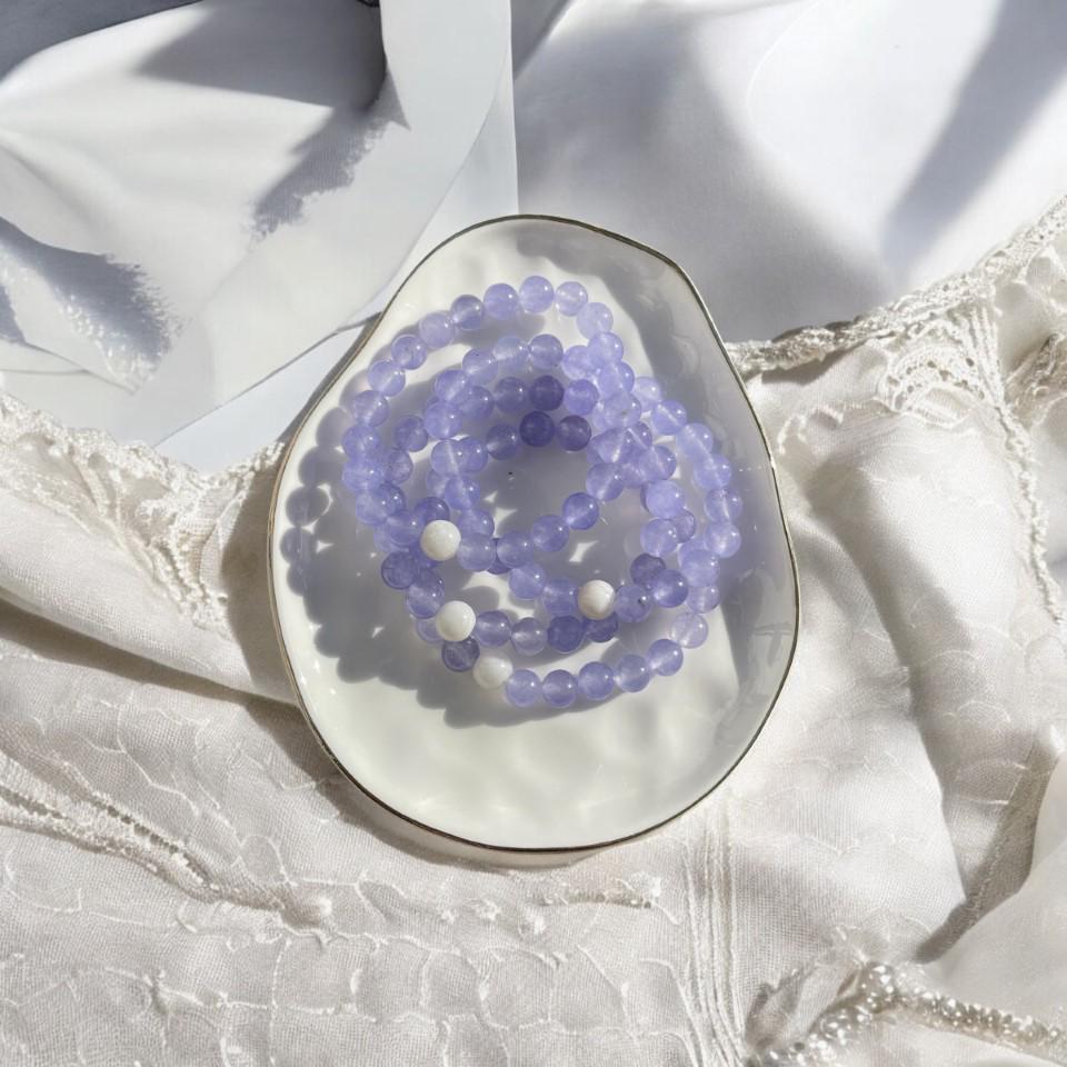 Add a touch of elegance and positive energy to your jewelry collection with this stunning 8mm dyed purple quartz bracelet. Featuring a luminous white pearl center stone, this bracelet combines vibrant color with timeless sophistication, making it a perfect accessory for any occasion.